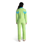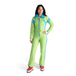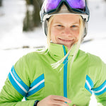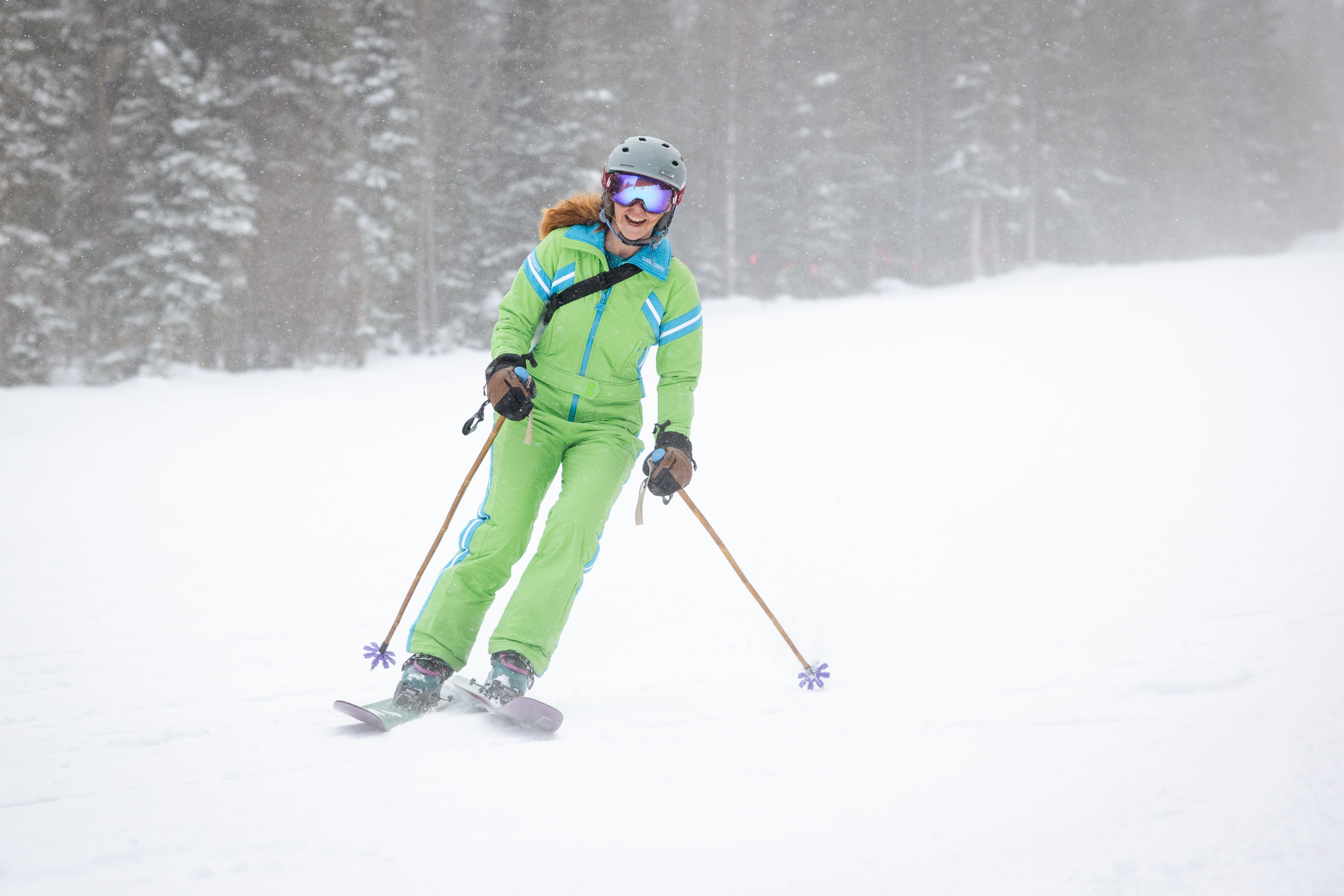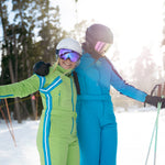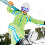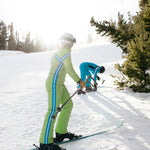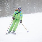 Alex's vibrant lime green and electric blue palette brings pure joy to the mountain, radiating energy and confidence with every turn.