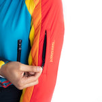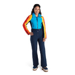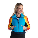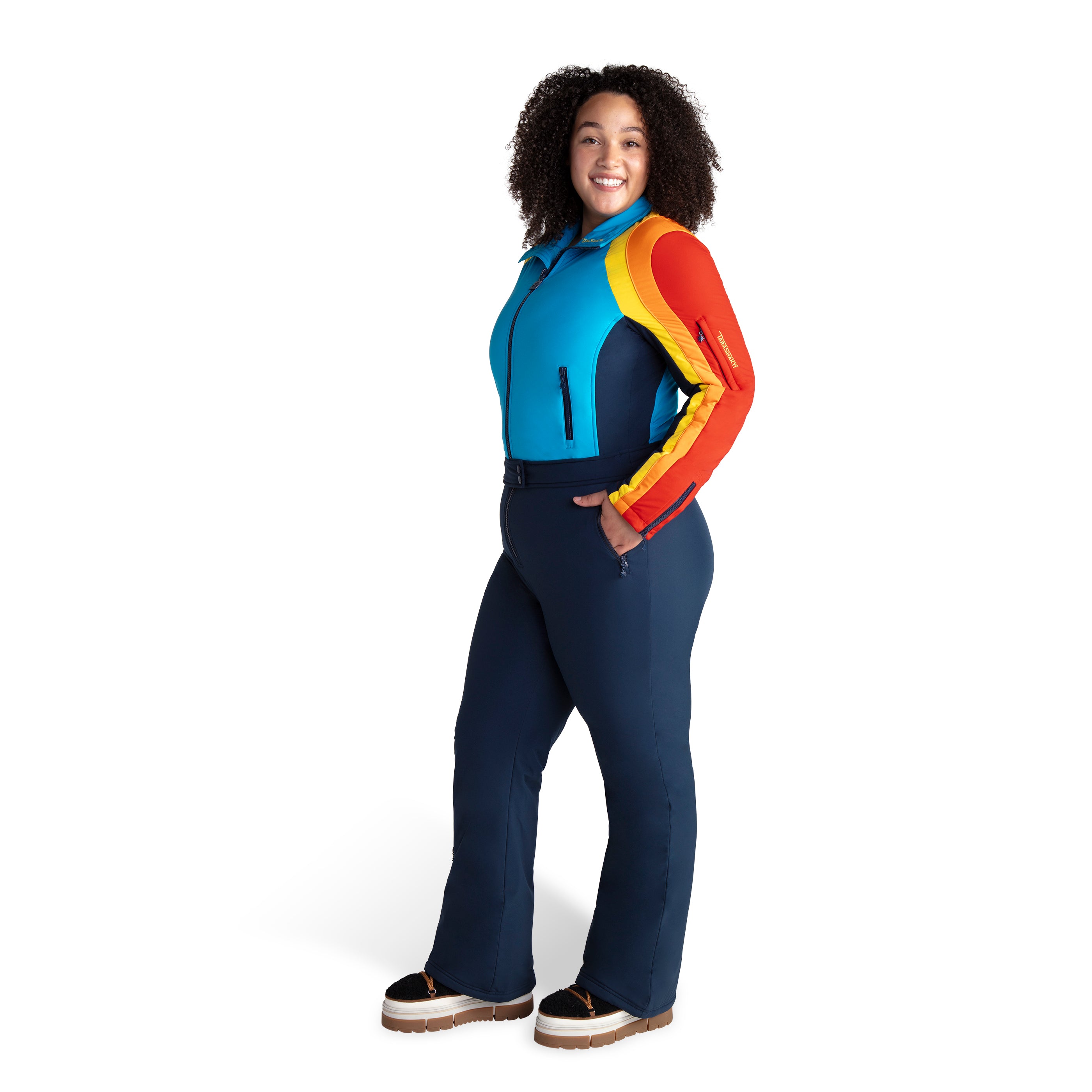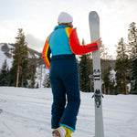 Grounded in navy with striking streaks of blue, red, orange, and yellow, she brings color, confidence, and charisma to every mountain.